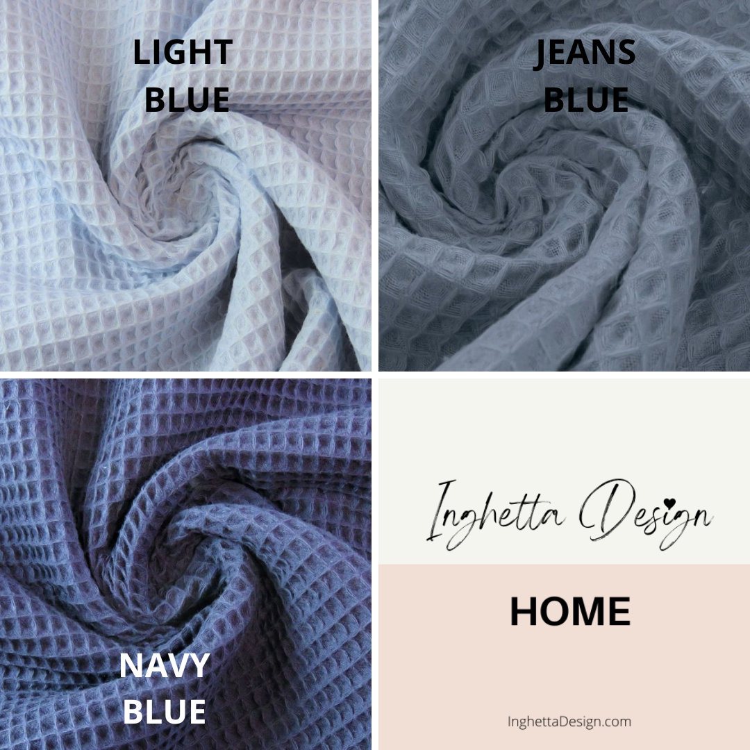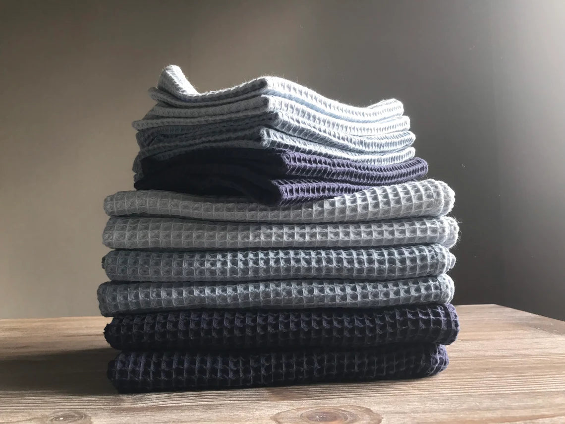 Cotton waffle tea towels, soft, beautiful and absorbent towels for kitchen. Available in two sizes. Towels have hanging loop. Three colors are available: Light blue, Jeans blue and Navy blue. Handmade in Belgium.