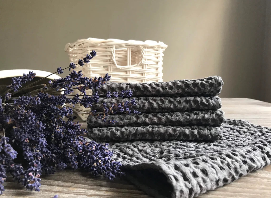 Set of 4 kitchen waffle linen dish clothes made in dark grey color. Natural eco-friendly dish cloth. Handmade in Belgium from European linen.