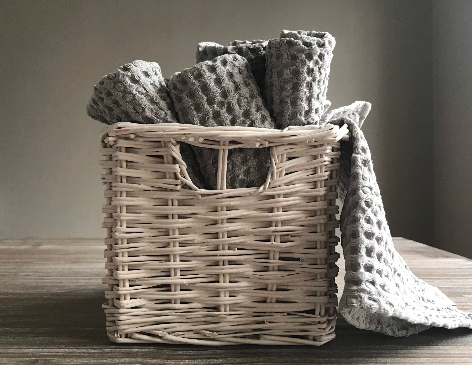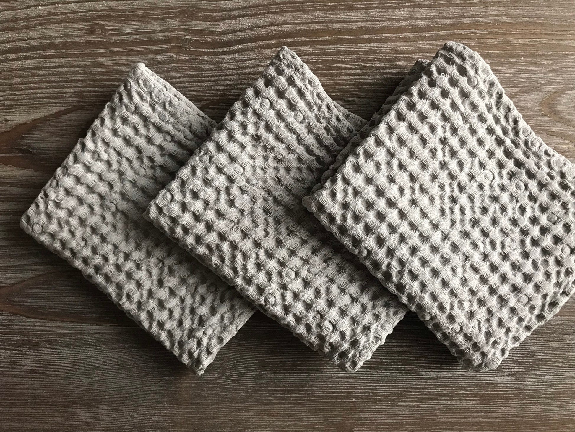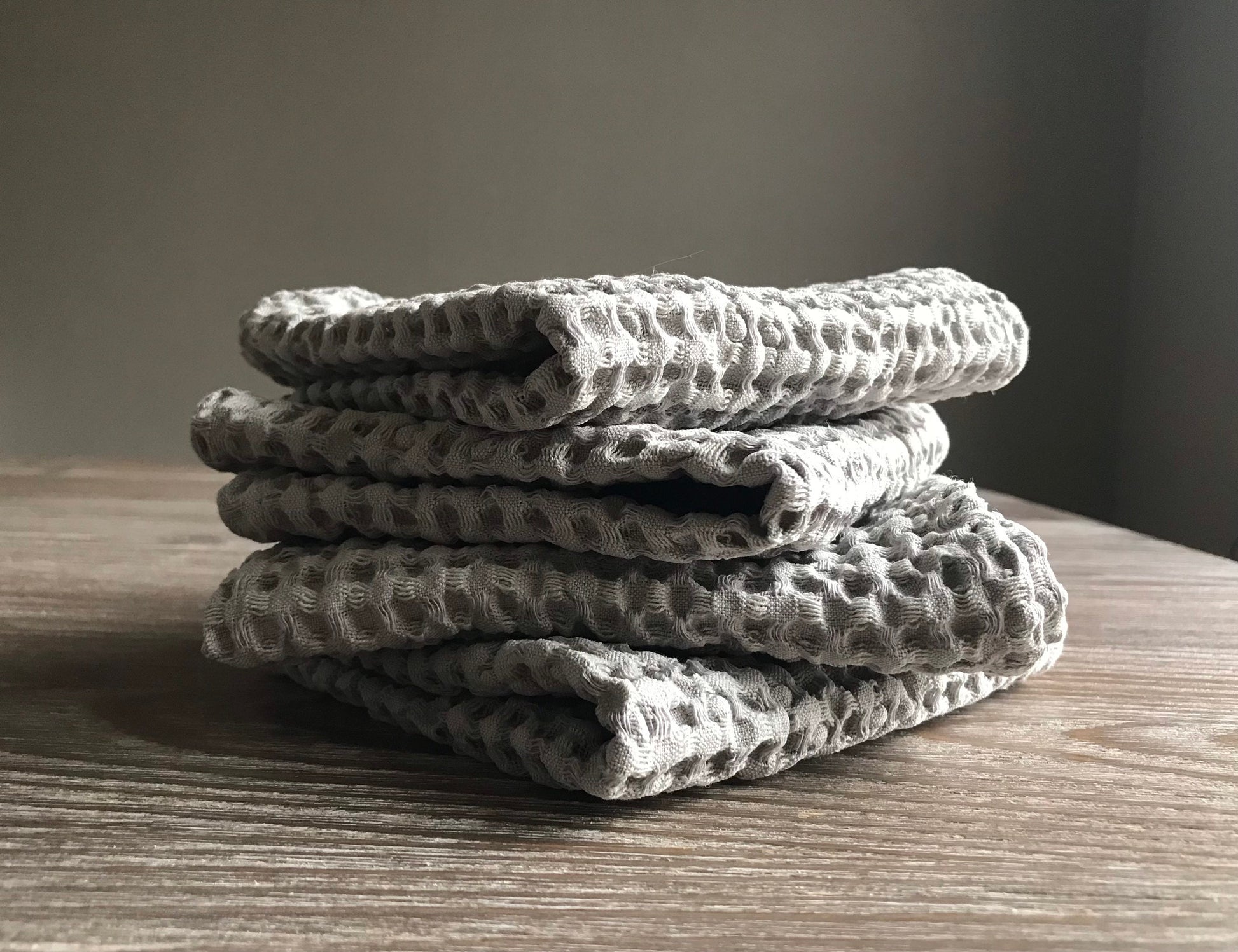 Set of 4 kitchen waffle linen dish clothes made in light gray color. Natural eco-friendly dish cloth. Handmade in Belgium from European linen.