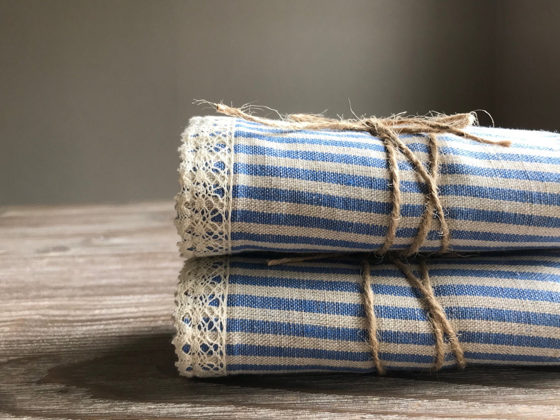 Linen tea towel with lace. Blue stripes