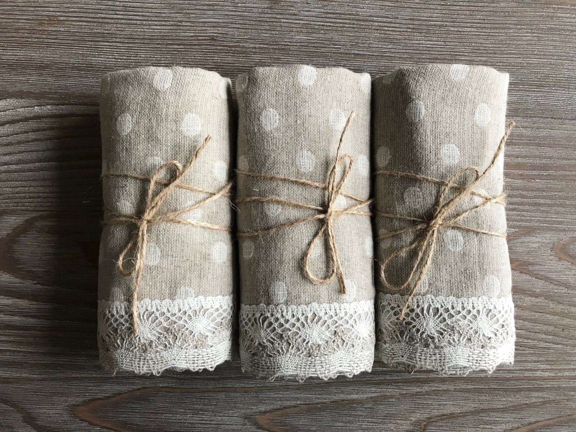 Linen tea towel with 100% linen lace made from polka dot heavy weight fabric. Linen is new luxury and trend because of eco-friendly characteristics. Linen is good fit for eco friendly kitchen. Handmade in Belgium from European (Baltic) linen.