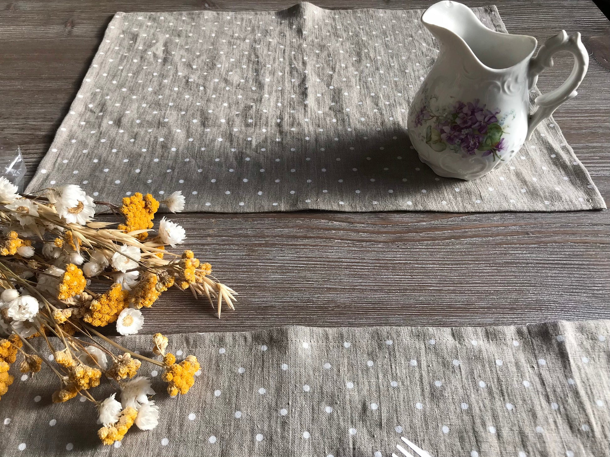 100% linen place mat with lovely polka dots design. Natural eco-friendly luxury place mat that can be centerpiece of your table. Handmade in Belgium from European linen.