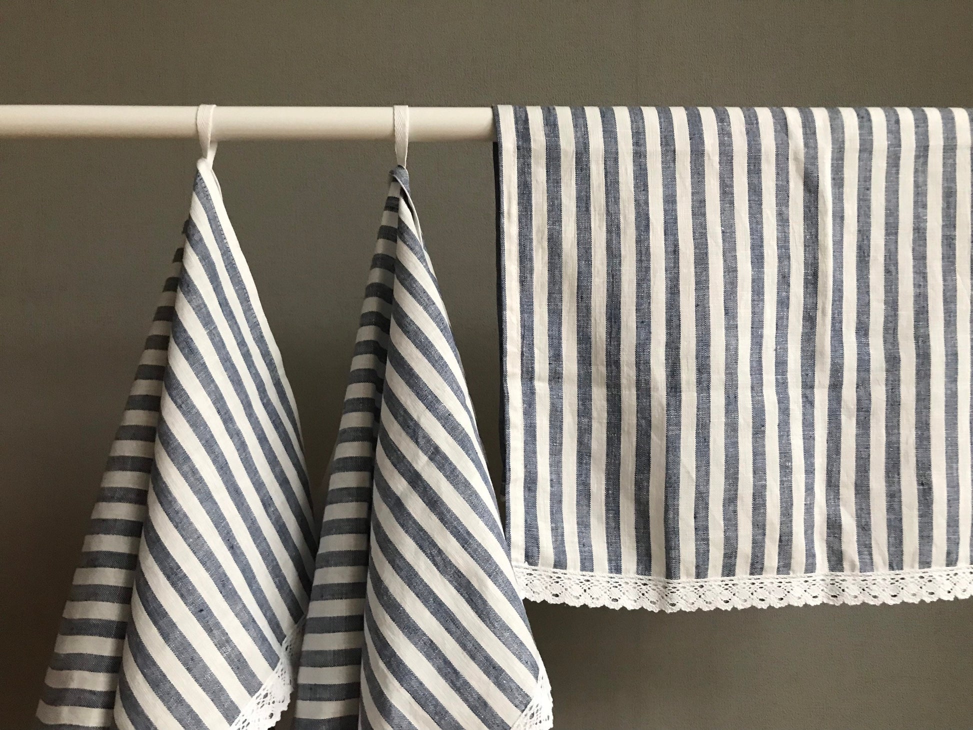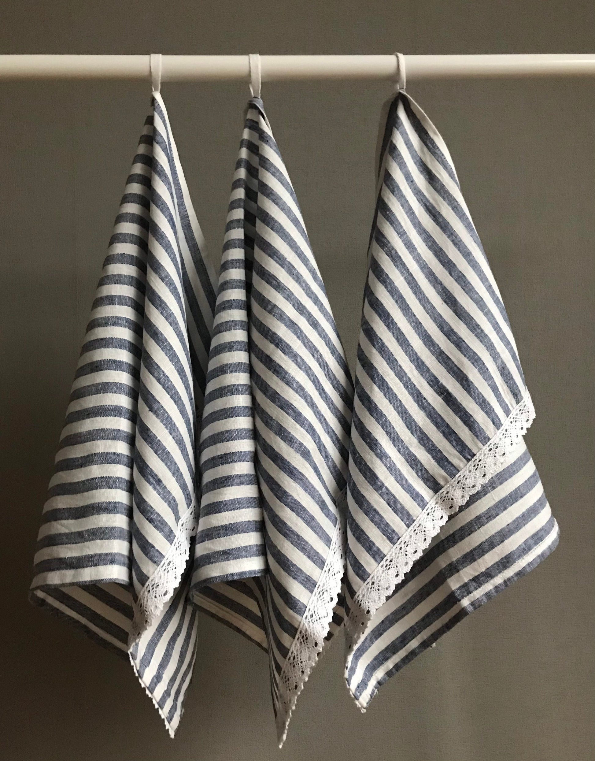 Linen tea towels with lace. Blue stripes kitchen towel